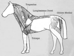 Os músculos principais nessa zona são o Longíssimus dorsi (que alonga ou encurta a atitude e que se encontra na zona de contacto com a sela) e o Trapezius na zona do garrote e pescoço.