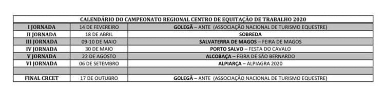 A 14 de Fevereiro arranca o Campeonato Regional Centro de Equitação de Trabalho na Golegã, composto por seis jornadas e uma final a 17 de Outubro na Golegã.