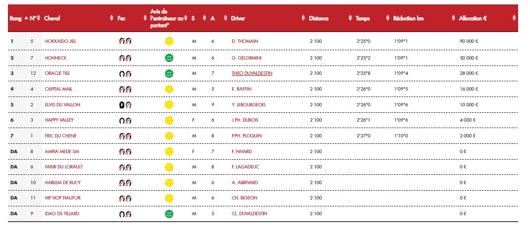 Surpreendentemente, depois de esperar na retaguarda, David Thomain pressionou Clément Duvaldestin e «Idao de Tillard», que haviam ultrapassado «Hohneck» e o driver Gabriele Gelormini, os favoritos da corrida. Uma corrida cheia de reviravoltas e intensidade desportiva, coroada com um tempo recorde de 1’09”1, que é simultaneamente o recorde da prova e da pista de Vincennes, detido por «Face Time Bourbon» e «Vivid Wise As», graças ao Prix René Ballière em 2021 e 2022.