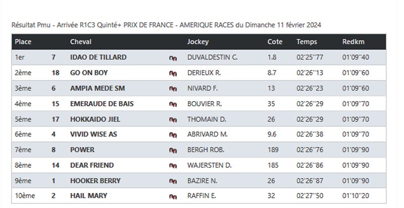 O trotador francês «Idao de Tillard», conduzido por Clément Duvaldestin, venceu o Prix de France em Vincennes neste domingo. O cavalo de 6 anos sucede «Bold Eagle», o último campeão a conquistar a dobradinha no Prix d’Amérique-Prix de France (2016 e 2017). A nova estrela do trote mundial, de pelagem castanha, derrotou o cavalo francês «Go On Boy», sob a condução do driver Romain Derieux, que ficou em segundo lugar, após uma final emocionante.