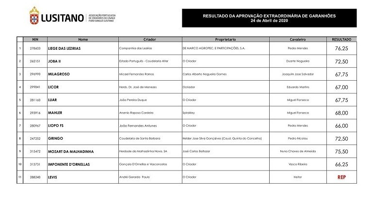 Dos 11 cavalos candidatos a reprodutores inscritos, 10 foram admitidos ao Livro de Reprodutores da Raça Lusitana.