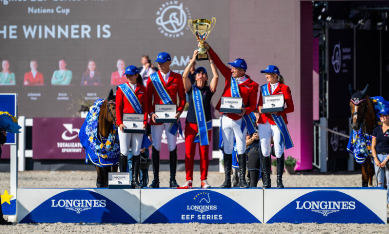 It was certainly a roller coaster of emotions today for the ten nations coming together for the culmination of the Longines EEF Series 2023, and the tension in the air was palpable. But hot favourites and newly crowned European bronze medallists, Austria held their nerve to deliver a perfect score of zero, with Gerfried Puck, Katharina Rhomberg and Max Kühner all on board their European Championship partners (Equitron Naxcel V, Cuma 5 & Elektric Blue P) each producing double clears, with Alessandra Reich completing the team with Europeans partner, Oeli R, to be crowned the Series champions for the first time.