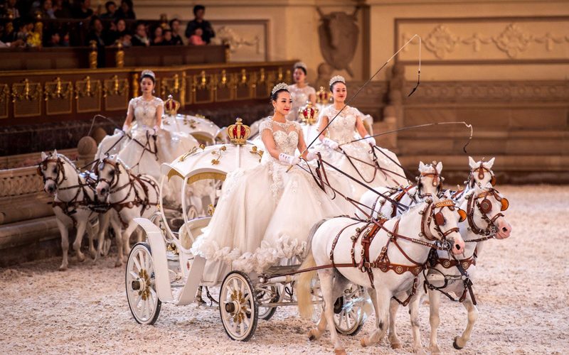 At one point in the show, women horse riders in white gowns and sparkling tiaras convey white carriages that would not look out of place at a British royal wedding.