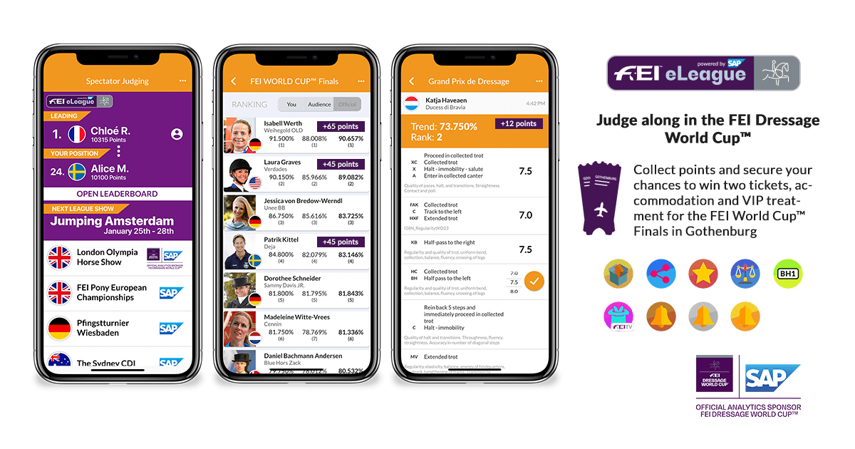 The FEI eLeague Dressage is the expansion of the well-established Spectator Judging® app, the state-of-the art-mobile application which enables fans to get in the judge’s seat, creating audience scores and rankings in real time. SAP, as the Official Analytics Sponsor of the FEI Dressage World Cup™, has built upon the success of the Spectator Judging® app making fans an integral part of the overall series.