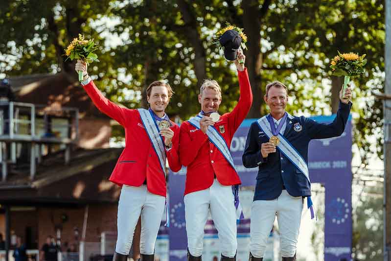 Individual glory for Germany’s Andre Thieme and his lovely mare DSP Chakaria brought the Longines FEI Jumping European Championship 2021 to the perfect close at Riesenbeck (GER) today. On an afternoon of spectacular sport, the 46-year-old rider rose from overnight silver into gold medal position in the first of two final rounds. And, once there, he held on tight, pinning Friday’s team gold medallists, Switzerland’s Martin Fuchs and Leone Jei, into silver while Sweden’s Olympic team gold and individual silver medallist Peder Fredricson and Catch Me Not took bronze.
