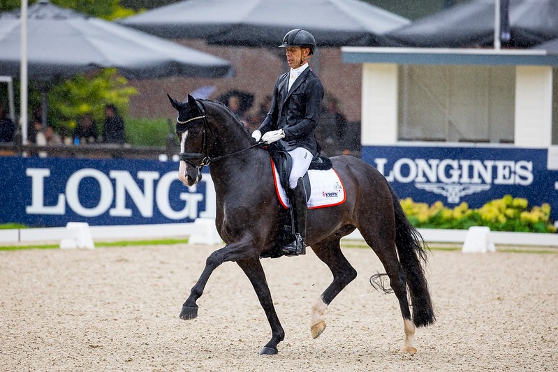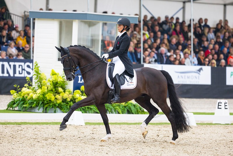 With a great score of 87,200, Zuperman OLD (Galleria’s Vincent Maranello x Destano) and Beatrice Hoffrogge wrapped up the top three of this World Breeding Dressage Championships 6-year-old Final. Two 8,8 for the trot and submission were granted to the Oldenburg stallion bred by Stefan Tietje as well as a double 9 for his canter and perspective. After being away from the competitions for a while due to an infection resulting in Zuperman now being blind to an eye, the pair has done quite a successful comeback. His rider, who also happens to be his owner, couldn’t be more proud of her champion: “I was super pleased we advanced to the final. The fact he feels so great on the last day and only got better as the weekend progressed gives me a lot of confidence towards the future”.