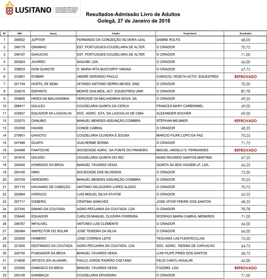 Decorreu no passado sábado (27/01) na Golegã, a primeira concentração para a Admissão de Garanhões ao Livro de Reprodutores da Raça Lusitana em 2018.Dos 33 machos apresentados, 29 foram admitidos ao Livro de Adultos.