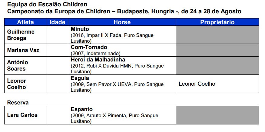 A seleção que representará Portugal no Campeonato da Europa de Dressage do escalão Children, a decorrer de 24 a 28 de Agosto em Budapeste, Hungria será composta por,