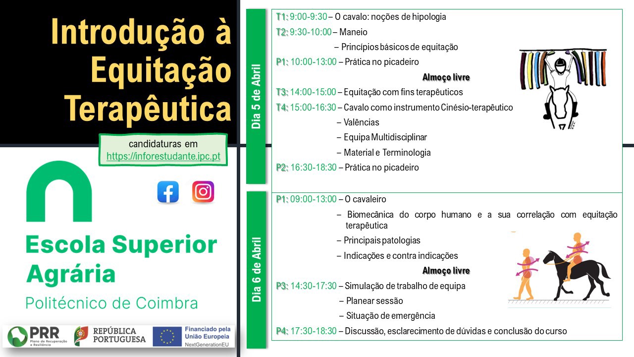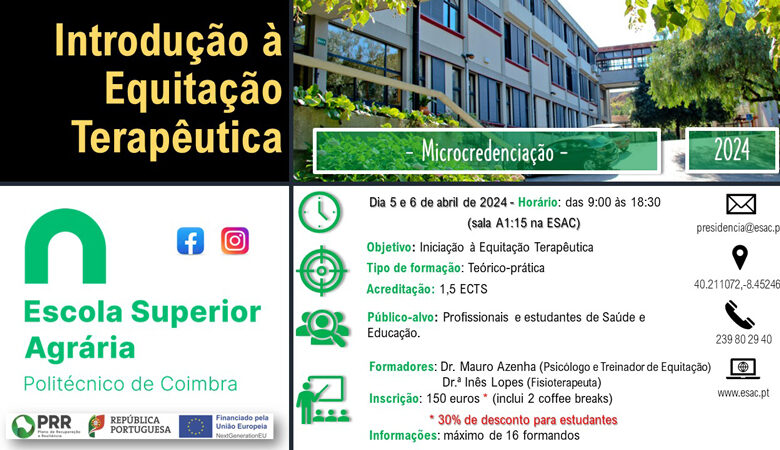 A Escola Superior Agrária do Politécnico de Coimbra (ESAC-IPC) irá lecionar, nos próximos dias 5 e 6 de abril, uma microcredenciação em Iniciação à Equitação Terapêutica.