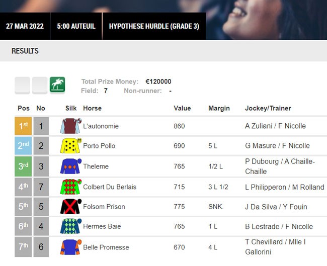 «Autonomie» foi a estrela neste domingo vencendo pela terceira vez consecutiva de forma impressionante o Prix Hypothèse Hurdle (3900m) (€120.000) no Hipódromo de Auteuil (Paris). O jóquei italiano Angelo Zuliani com «Autonomie» manteve-se na liderança da prova logo após saltar o primeiro obstáculo.