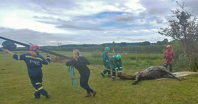 Uma corporação de bombeiros na Grã-Bretanha foi chamada a resgatar um cavalo de 6 anos que foi encontrado preso e deitado de lado num lago lamacento.