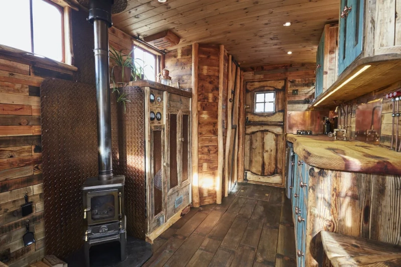 O veículo foi totalmente restaurado com móveis de madeira maciça à medida.