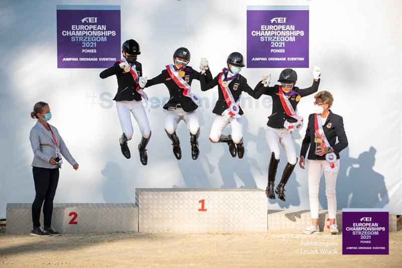 Terminada esta quinta-feira (12) a prova por equipas do Campeonato da Europa de Póneis em Strzegom, a Alemanha conquistou a Medalha de Ouro por equipas, prata para a Dinamarca (campeã em título) (221,174 pts) e o bronze para a Holanda (218,428 pts).