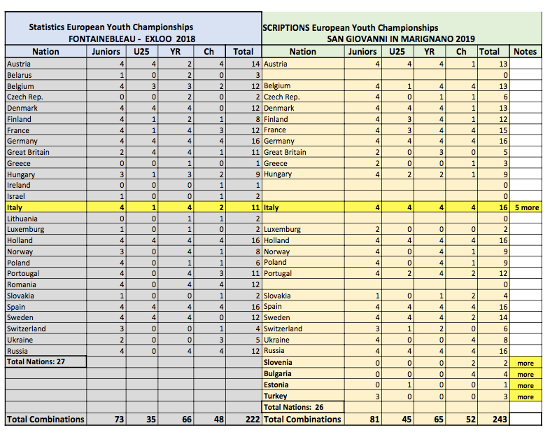 Abaixo o quadro comparativo com os números do anterior Campeonato da Europa que decorreu em Fontainebleau (França) e em Exloo (Holanda) em 2018, participaram 27 países e um total de 222 conjuntos.