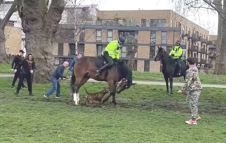 Um cavalo da polícia em patrulha no leste de Londres, ficou ferido após ser atacado por um cão num parque.