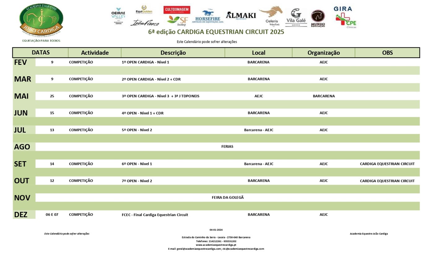 Já é conhecido o calendário do Cardiga Equestrian Circuit 2025. Este circuito, que vai na 6ª edição, abrirá com o 1º Open e realizar-se-á nas instalações da Academia Equestre João Cardiga, em Barcarena no dia 9 Fevereiro.