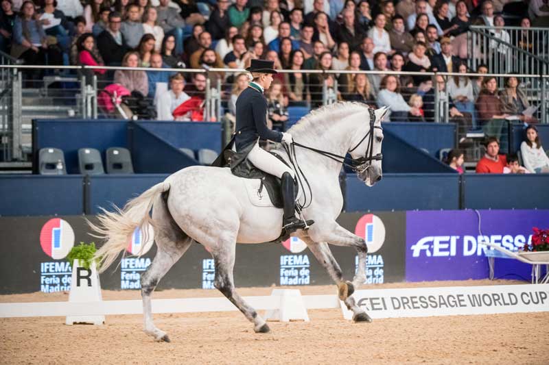 A cavaleira portuguesa Maria Caetano Couceiro subiu, este domingo, ao terceiro lugar do pódio no Grande Prémio Freestyle da quarta qualificativa da Taça do Mundo de Dressage que decorreu em Madrid.