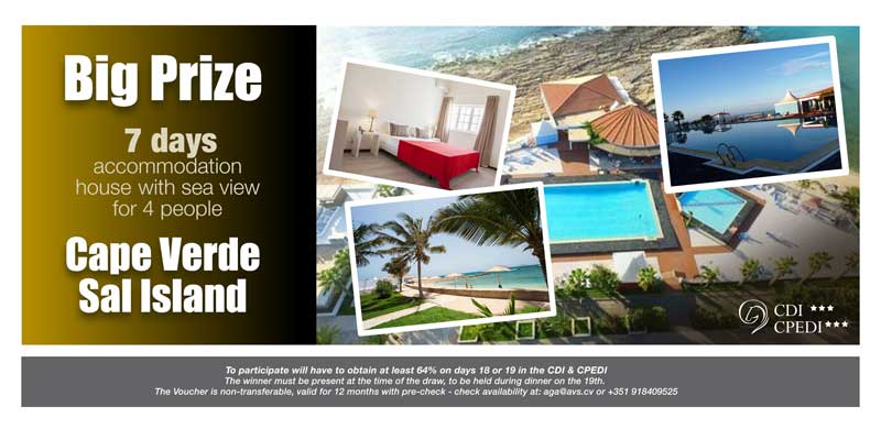 Será também sorteado um prémio especial entre os participantes (CDI3* e CPEDI3*) com pontuação mínima de 64%, nos dias 18 e 19 de Maio – 7 dias de alojamento na Ilha do Sal numa vivenda de sonho com vista mar, com capacidade para 4 pessoas. Condição obrigatória, o vencedor deve estar presente no momento do sorteio durante o jantar de 19 de Maio.