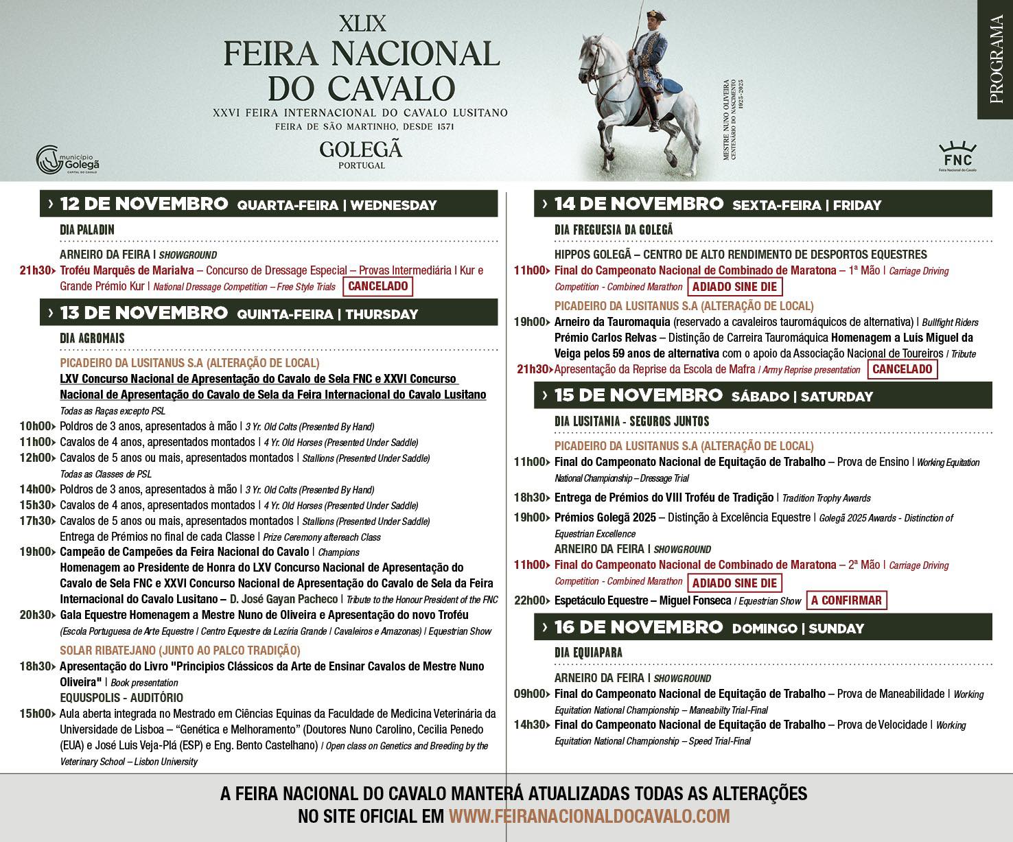 Comunicado Oficial — Alterações à Programação da XLIX Feira Nacional do Cavalo