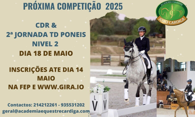 Estão abertas, até 14 de maio, as inscrições para o Concurso de Dressage Regional (CDR) e para a 2.ª Jornada do Troféu Dressage Póneis – Nível 2, que terão lugar no dia 18 de maio, a partir das 10h00, na Academia Equestre João Cardiga, em Barcarena, Oeiras.