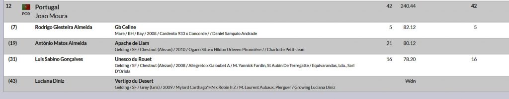 Tanto Rodrigo Giesteira Almeida (Gb Celine) como António Matos Almeida (Apache de Liam) estrearam as suas montadas nesta Taça das Nações, provavelmente reservando os seus melhores cavalos, Kafka Vd Heffinck e Irene van de Kwachthoeve, para o Grande Prémio no domingo (01/09). Unesco du Rouet de Luís Sabino Gonçalves, após inúmeras classificações expressivas este ano, (Roterdão, Atenas, Paris, Lisboa, Mannheim, St. Tropez, Sharjah entre outros) certamente estará a precisar de uma pausa, enquanto Luciana Diniz optou também por poupar Vertigo du Desert para o Grande Prémio.