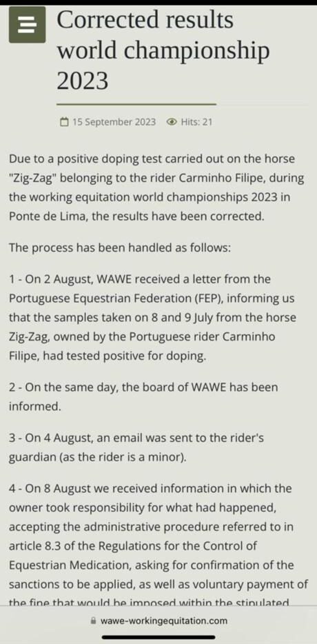 De acordo com notícia veiculada no dia 15/09/2023 na página da World Association for Working Equitation (WAWE), acerca da correção de resultados referentes ao Campeonato do Mundo de Equitação de Trabalho de Juniores e Jovens Cavaleiros 2023, o cavalo “Zig-Zag”, montado pela cavaleira Carminho Filipe durante o Campeonato do Mundo de Equitação de Trabalho realizado em Ponte de Lima, testou positivo no controlo anti doping.