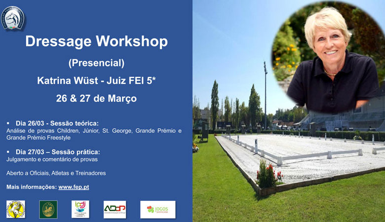 A FEP informa que vai realizar-se um Dressage Workshop (Presencial) com Katrina Würst, nos dias 26 e 27 de Março.