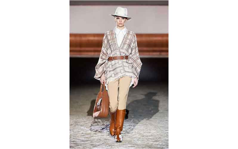 Linhas clássicas perseguem-se numa paleta de cores fortes e requintadas que remetem a cenários elegantes e preciosos. Um verdadeiro espetáculo que salta entre casacos, malhas tweed, calças e botas de montar, blusas com ar do antigo regime combinadas com acessórios retirados diretamente das caixas de joias.