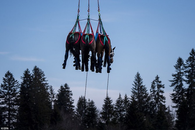 A Força Aérea Suíça realizou esta sexta-feira, 9, um teste inédito: um cavalo foi içado por um helicóptero militar e transportado para uma distância considerável. A ideia era saber se a técnica pode ser utilizada para transferir animais feridos ou em stress mais rapidamente para um hospital veterinário.