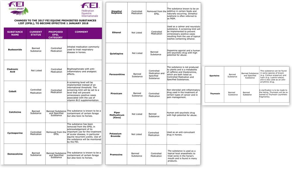 A Federação Equestre Internacional revelou a lista de novas substâncias proibidas ou sujeitas a um exame médico, a partir de 1 de Janeiro de 2018.
