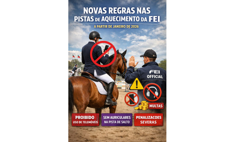 A partir de 1 de janeiro de 2026, a Federação Equestre Internacional (FEI) implementou novas restrições ao uso de dispositivos eletrónicos nas pistas de aquecimento, integradas na revisão geral dos seus regulamentos aprovada na Assembleia Geral de 2025.