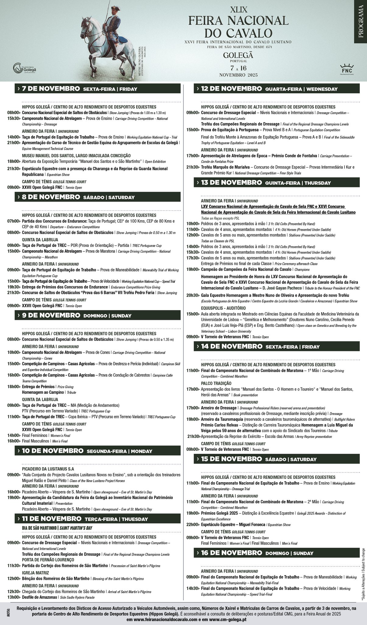 Nesta edição, a feira integra também a XLVIV Feira Nacional do Cavalo, a XXVI Feira Internacional do Cavalo e a emblemática Feira de São Martinho, cuja origem remonta a 1571. Ao longo de dez dias, o público poderá assistir a competições equestres, demonstrações de diferentes raças, exposições temáticas e uma programação cultural variada, que valoriza a identidade equestre portuguesa.
