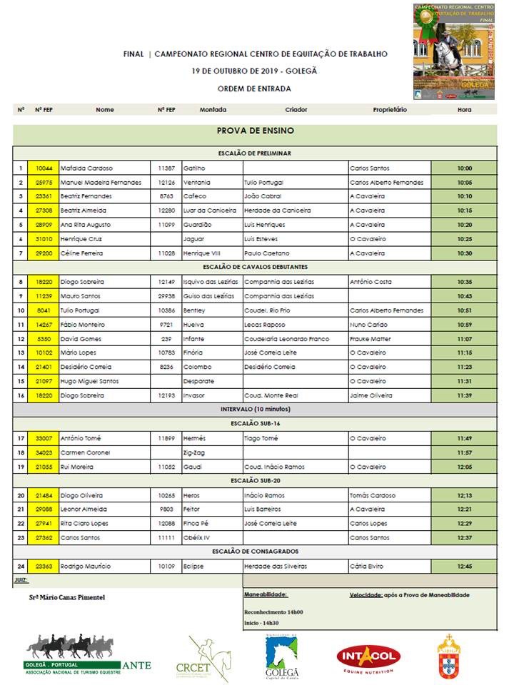 Após 5 jornadas ao longo do ano, vai disputar-se neste sábado, a final do V Campeonato Regional Centro de Equitação de Trabalho no Largo do Arneiro na Golegã que vai reunir 24 conjuntos nos escalões Consagrados, Preliminares, Debutantes, Sub-20 e Sub-16.”