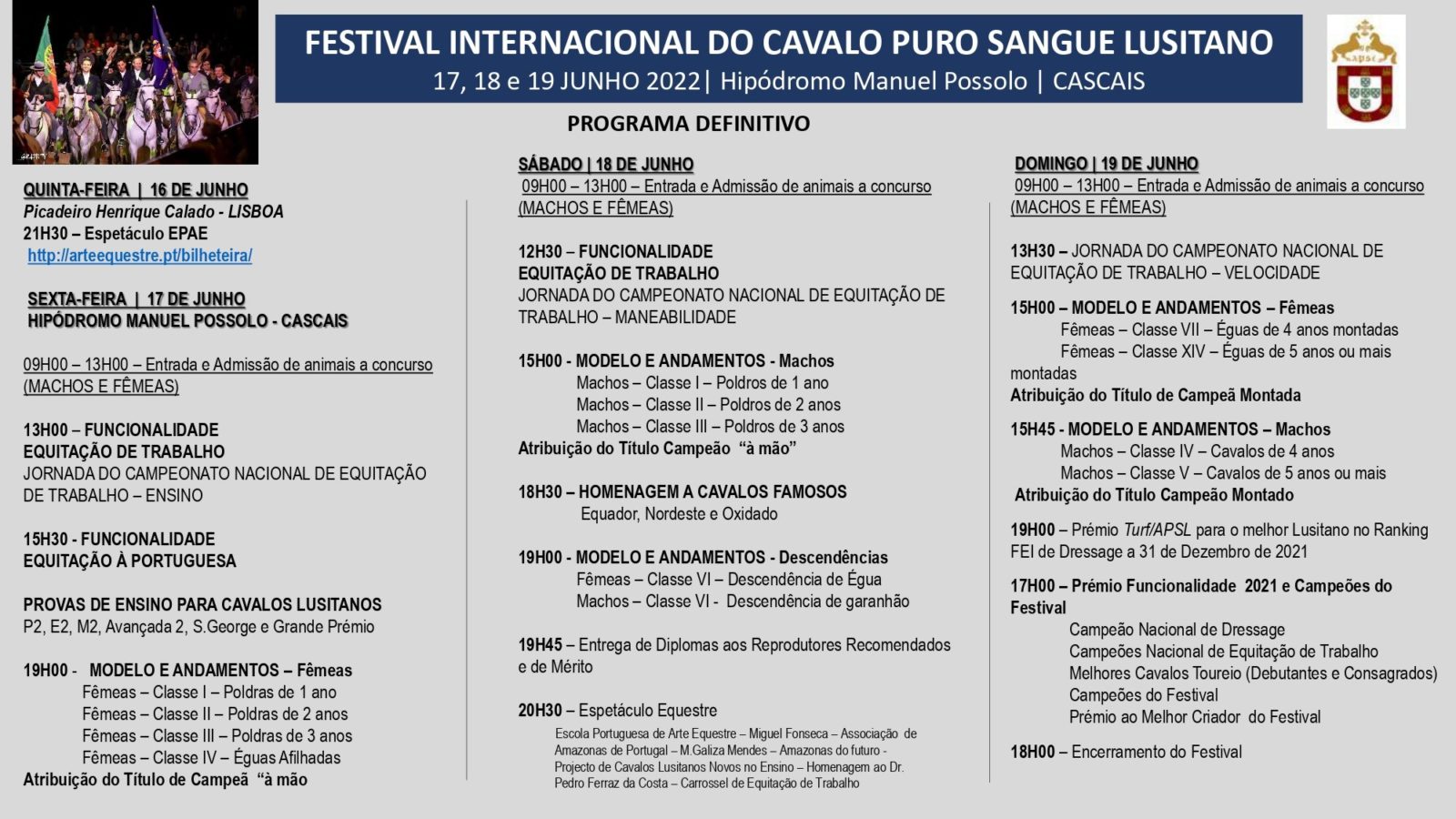 Após as eliminatórias, foram premiadas esta sexta-feira, com as Medalhas de Ouro e Prata, as melhores fêmeas do XXXIII Festival Internacional do Cavalo Puro Sangue Lusitano a decorrer no Hipódromo Manuel Possolo em Cascais até domingo (19).