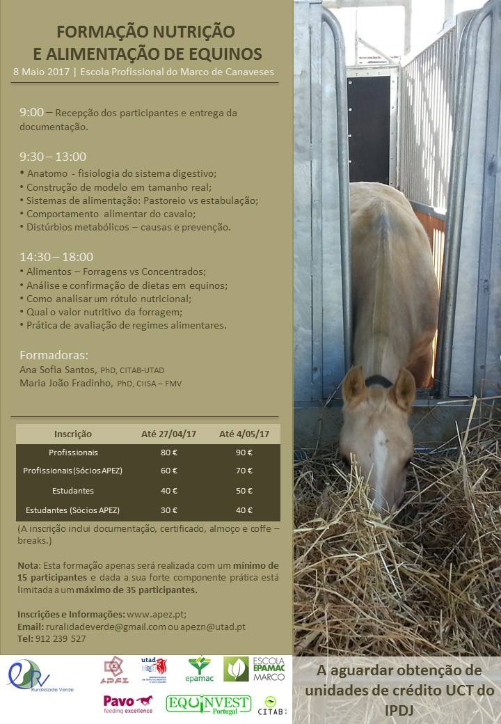 A Ruralidade Verde, em colaboração com a Universidade de Trás-os-Montes e Alto Douro (UTAD), a Escola Profissional do Marco de Canavezes (EPAMAC) e com a Associação Portuguesa de Engenharia Zootécnica (APEZ), vai realizar, no próximo dia 8 de Maio, inserida no âmbito da semana Equestre da EPAMAC, um Curso de Formação Avançada com forte componente prática na área de nutrição e alimentação de equinos.