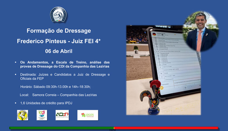 Gostaríamos de informar que no dia 6 de abril, na Companhia das Lezírias, será realizado um curso de Formação em Dressage voltado para Juízes N1, N2, N3 e Candidatos a Juízes. Este curso será ministrado pelo Juiz Internacional 4*/L3 Frederico Pintéus.