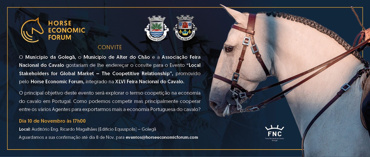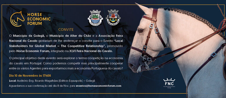 O Município da Golegã, o Município de Alter do Chão e a Associação Feira Nacional do Cavalo convidam para o evento Local Stakeholders for Global Market – The Coopetitive Relationship. Juntos vamos debater a coopetição na economia do Cavalo. Como podemos cooperar para exportarmos mais?