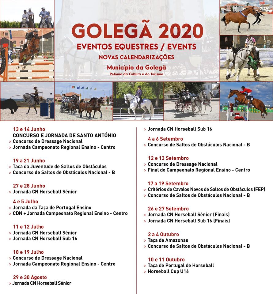 Após o período de confinamento e de controlo à pandemia de COVID 19 e com a reabertura da prática da competição federada outdoor, a Golegã – Capital do Cavalo, reagendou alguns dos seus concursos e irá iniciar a competição no Centro de Alto Rendimento de Desportos Equestres, já no próximo fim de semana, dias 13 e 14 de Junho, com um Concurso Nacional e um Concurso Regional de Ensino.