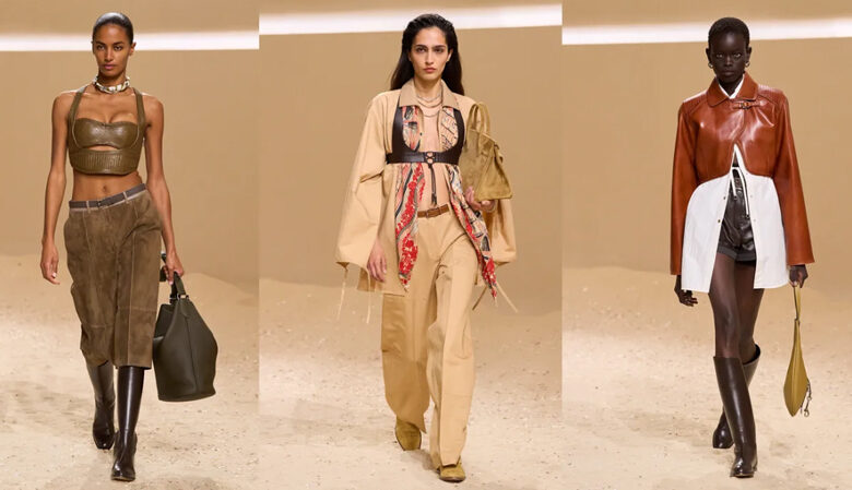 A paleta de cores evocava as terras áridas e o céu aberto da Camarga: tons de castanho, tabaco, areia, bege, branco e preto, pontuados por notas vibrantes de vermelho e azul profundo. O resultado é uma coleção de beleza silenciosa, mas profundamente sensual — fiel à elegância contida que define a Hermès.