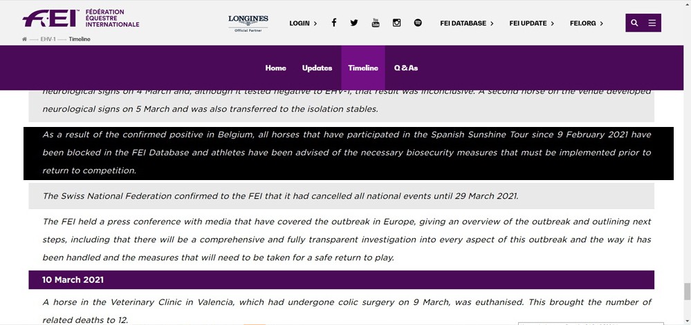 Após resultados positivos ao Herpes Vírus Equino (EHV1), a Federação Equestre Internacional (FEI) bloqueou na sua base de dados, todos os cavalos que participaram no Sunshine Tour em Vejer de la Frontera, Espanha, desde 9 de Fevereiro.