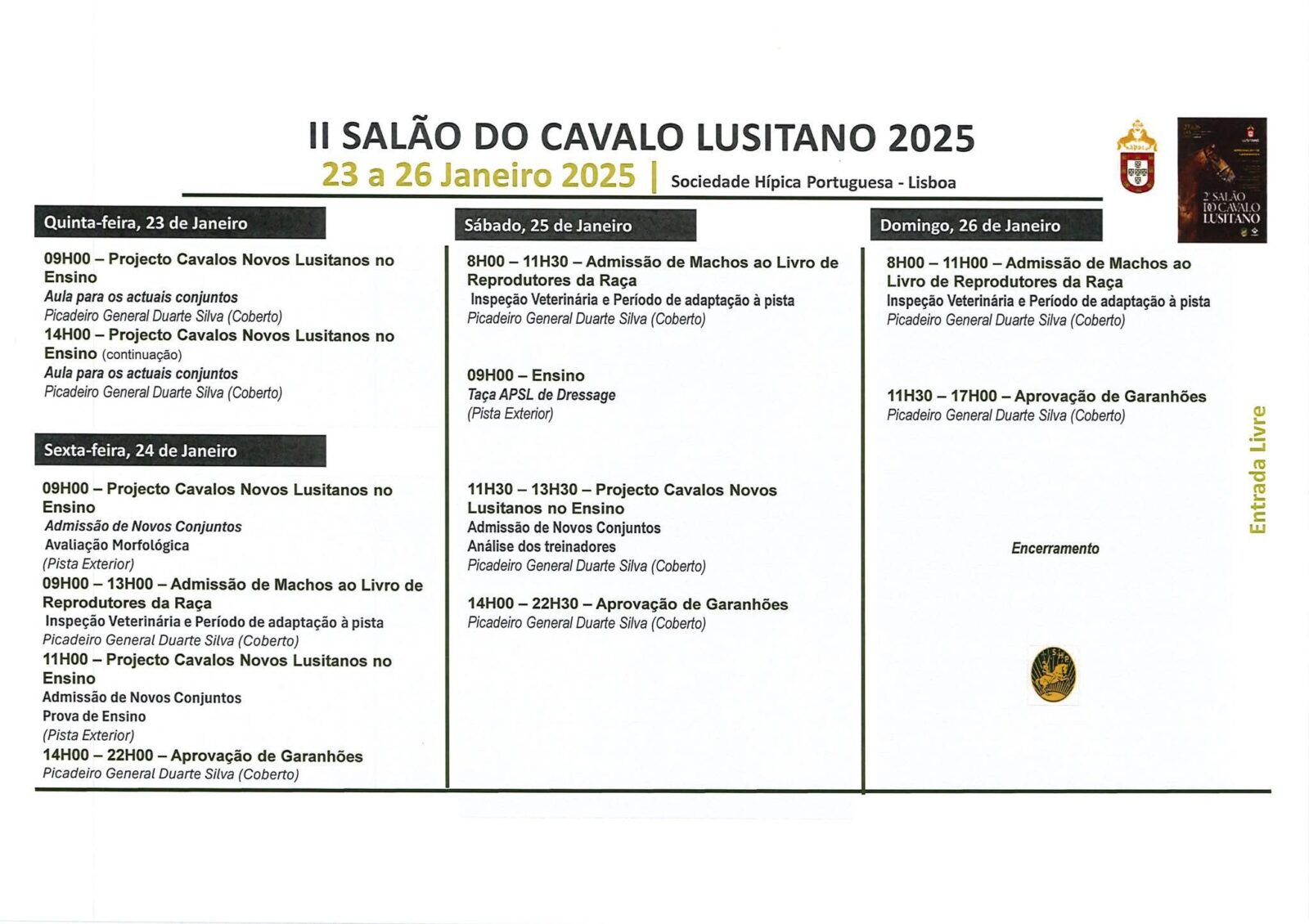 A APSL informa que, devido ao elevado número de cavalos inscritos para a Aprovação de Reprodutores, foi necessário ajustar o programa do II Salão do Cavalo, que ocorrerá de 23 a 26 de janeiro na Sociedade Hípica Portuguesa, em Lisboa.