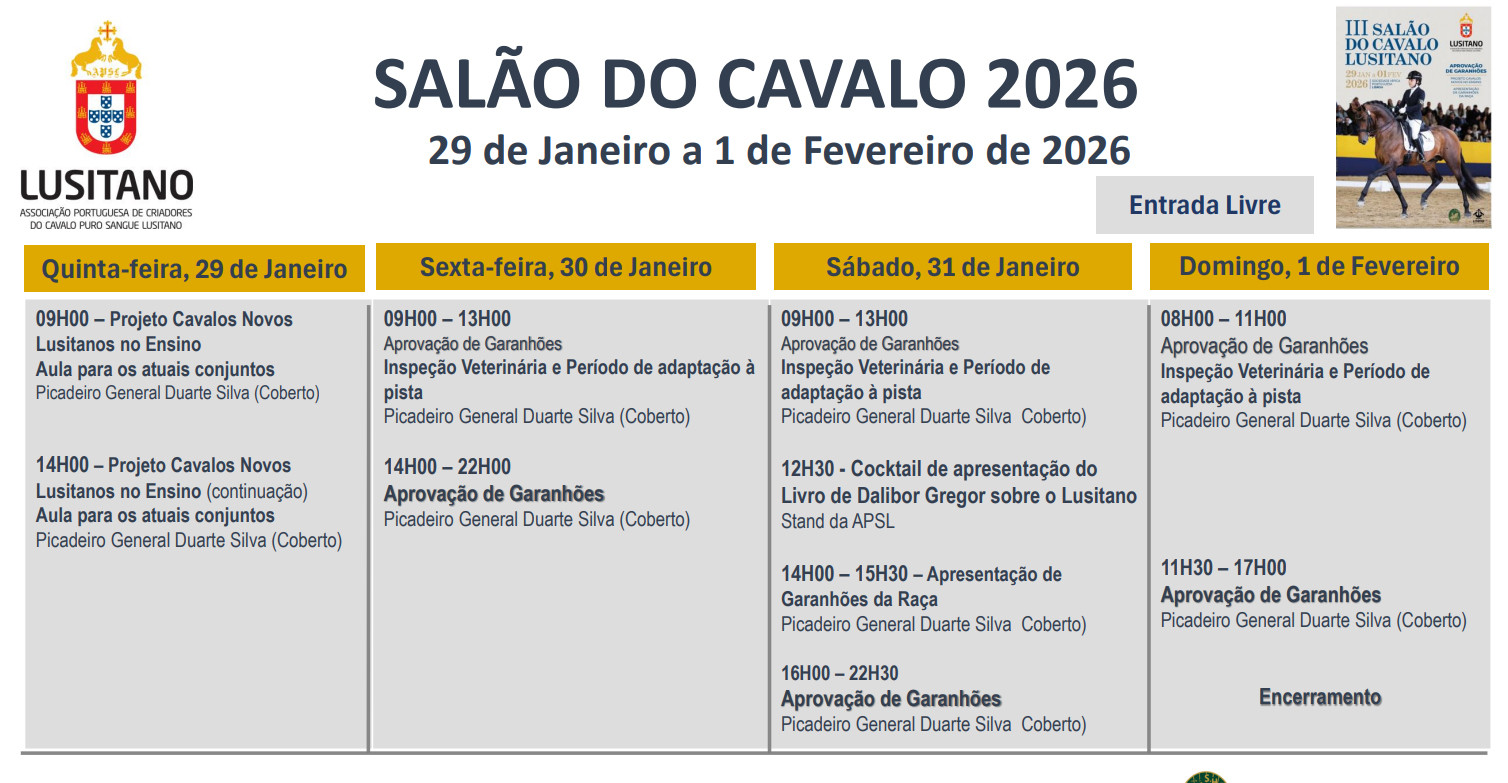 O III Salão do Cavalo Lusitano realiza-se de 29 de janeiro a 1 de fevereiro de 2026, na Sociedade Hípica Portuguesa, em Lisboa, reunindo criadores, profissionais e aficionados em torno da excelência do Puro-Sangue Lusitano.