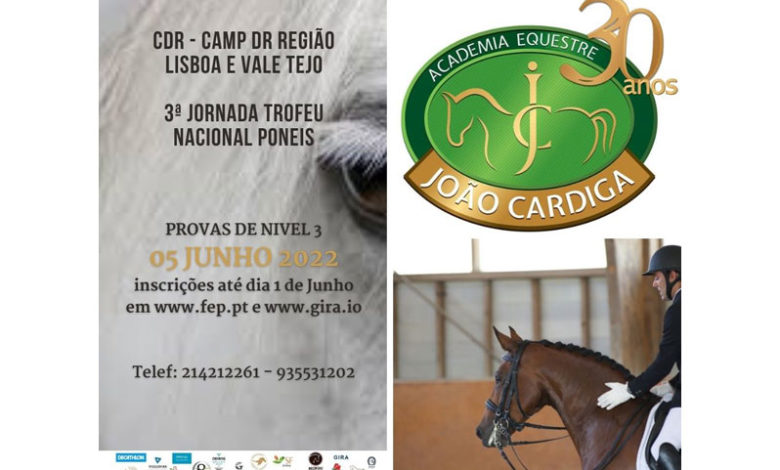 Estão abertas as inscrições até dia 3 de Junho para o CDR – Concurso Dressage Região Lisboa e Vale Tejo e a 3ª Jornada do Troféu Nacional de Póneis, que se realizará na Academia Equestre João Cardiga, dia 5 de Junho 2022, a partir das 14h00.