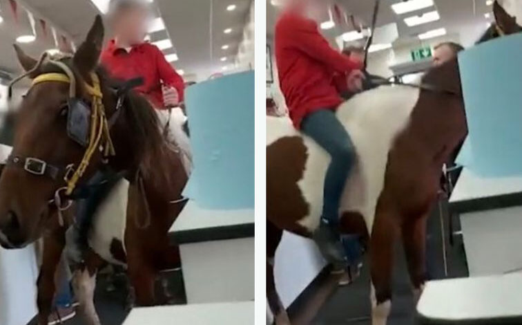 No vídeo de 30 segundos, é possível ver os dois jovens num restaurante de fast-food montados em póneis, enquanto os restantes clientes olham surpreendidos.
