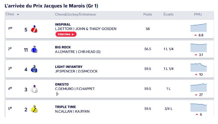 «Inspiral» montada por Frankie Dettori venceu este domingo (13) o Prix du Haras de Fresnay-le-Buffard Jacques le Marois em Deauville, pelo segundo ano consecutivo.
