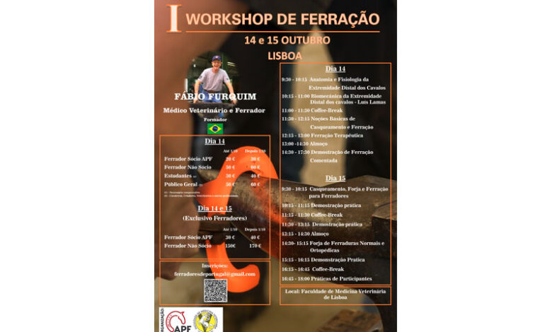 A Associação Portuguesa de Ferradores vai organizar nos dias 14 e 15 de Outubro na Faculdade de Medicina Veterinária de Lisboa o Iº Workshop de Ferração da APF.