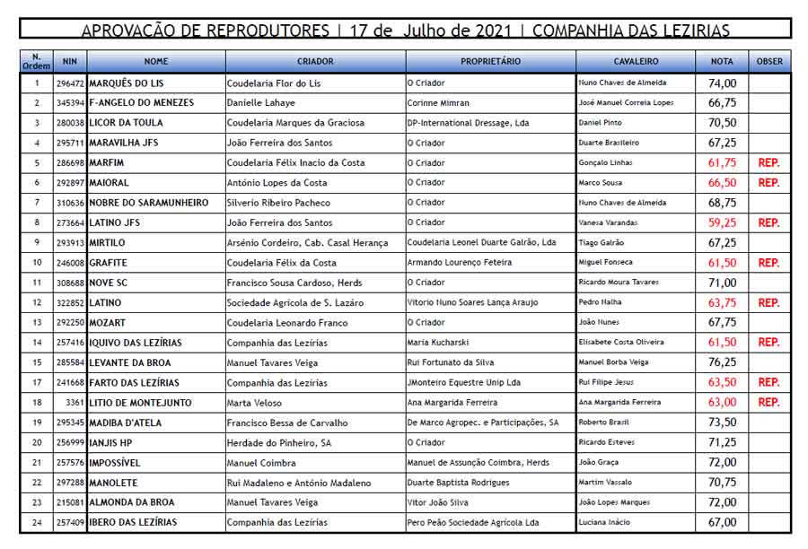 Dos 24 machos candidatos a reprodutores, 16 foram admitidos ao Livro de Reprodutores da Raça Lusitana, e 8 foram reprovados.