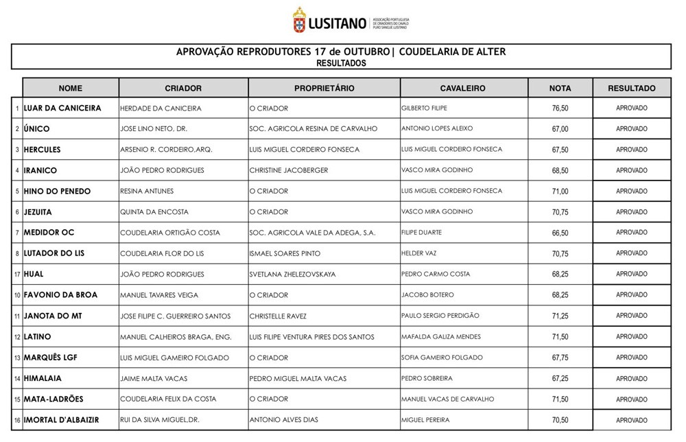 «Luar da Caniceira» de 5 anos, (Escorial x Vinheta por Nuxeque) da Coudelaria Herdade da Caniceira, montado por Gilberto Filipe, foi aprovado como reprodutor pela APSL, tendo obtido a pontuação mais elevada de 76,50 pontos desta Admissão de Garanhões.
