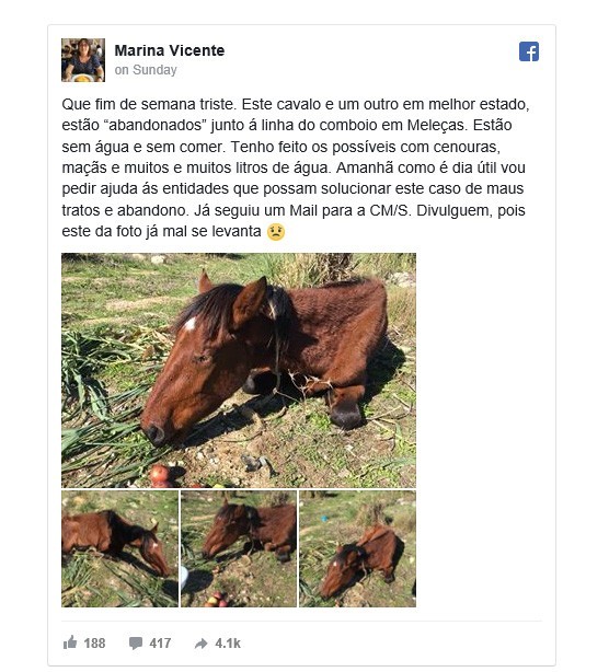 Este fim-de-semana, através das redes sociais, uma utilizadora denunciou o caso de dois cavalos, em mau estado, que estavam “‘abandonados’ junto á linha do comboio em Meleças (…) sem água e sem comer”.
