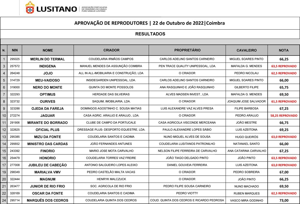 Dos 21 machos candidatos a reprodutores, 13 foram admitidos ao Livro de Reprodutores da Raça Lusitana, e 8 foram reprovados.